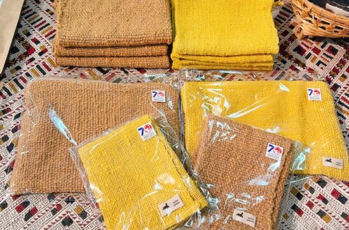 Blog みらいファームとのコラボ 2025年8月20日 / 山梨のB型事業所 みらいファームさんで有機栽培した白綿、茶綿をガラ紡で糸にして 利用者さんが手織りして、生地に仕上げました。 白綿生地はカモミールで黄色に染めてもらっています。 この生地をラオスの障がい作業所でハンカチタオル、ポーチに仕立ててみました!作業はパージューが担当。 ラオスと山梨、両方の障がい者雇用を支える製品になります。 たくさん織れるわけではないので、出来上がりも少量ですが。日本側の福祉事業所の製品開発に役立てばと思います。